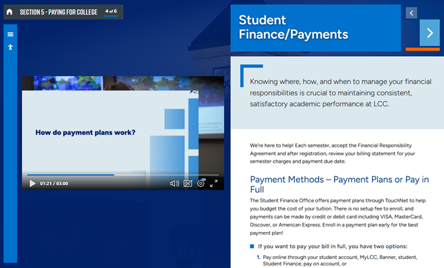 The video features LCC-specific information and an LCC student, embedded directly into the orientation so students can't miss it and strategically positioned before they register for classes. Parents can also access it as guests, ensuring the entire support system understands the payment process. As Ronda put it, "Students cannot say 'I didn't know about the payment plan.'"