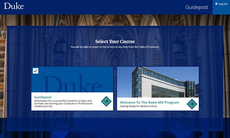 Duke's solution centered on its structure: a centralized Guidepost Course paired with individual school-specific Courses. The Guidepost Course serves as the foundation—a centralized Student Affairs module available to all graduate and professional students. It contains information relevant to all students, remains available year-round to accommodate various start dates, and serves as a reference students can return to at any time throughout their time at Duke.